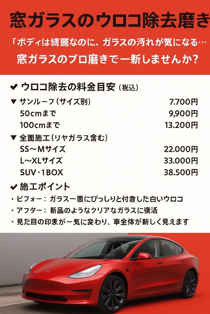 テスラ モデルSのガラスルーフ&リヤガラスに付着したウロコ汚れ(シリカスケール)を徹底除去しました。