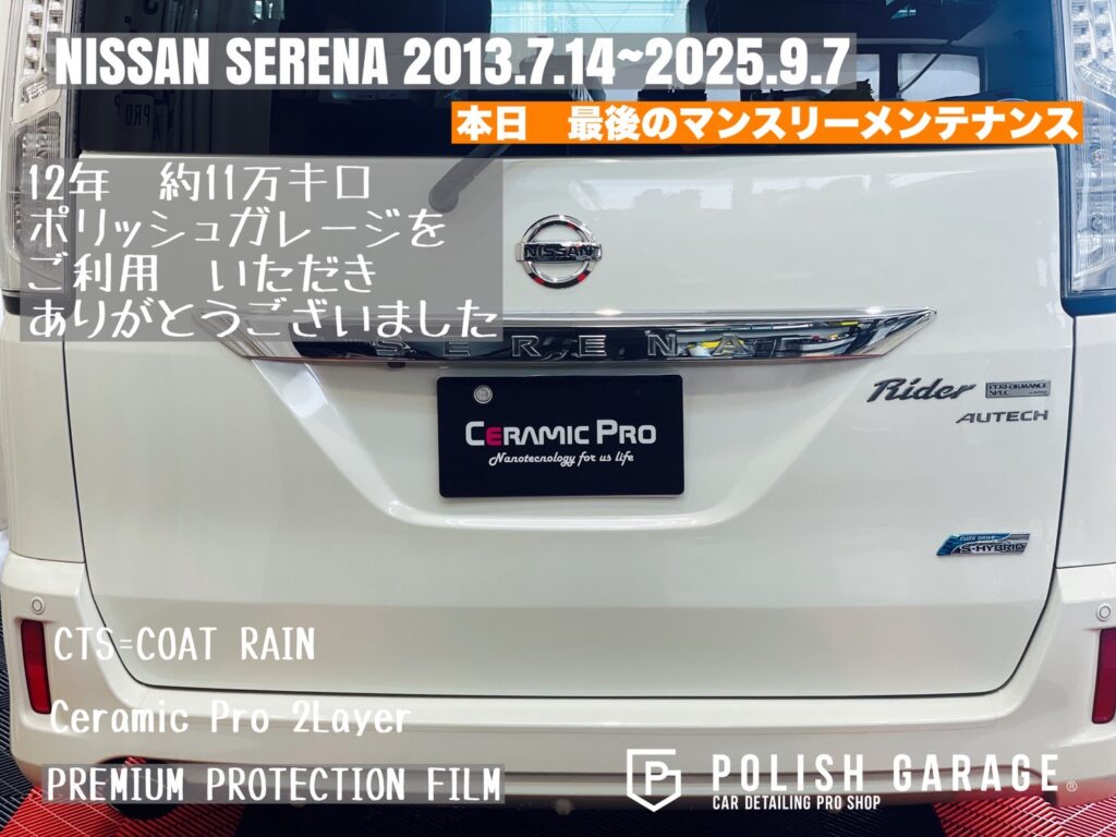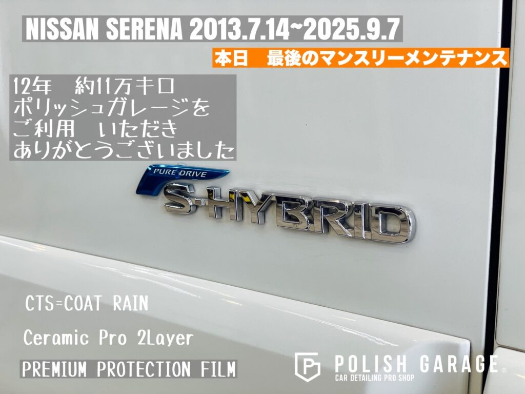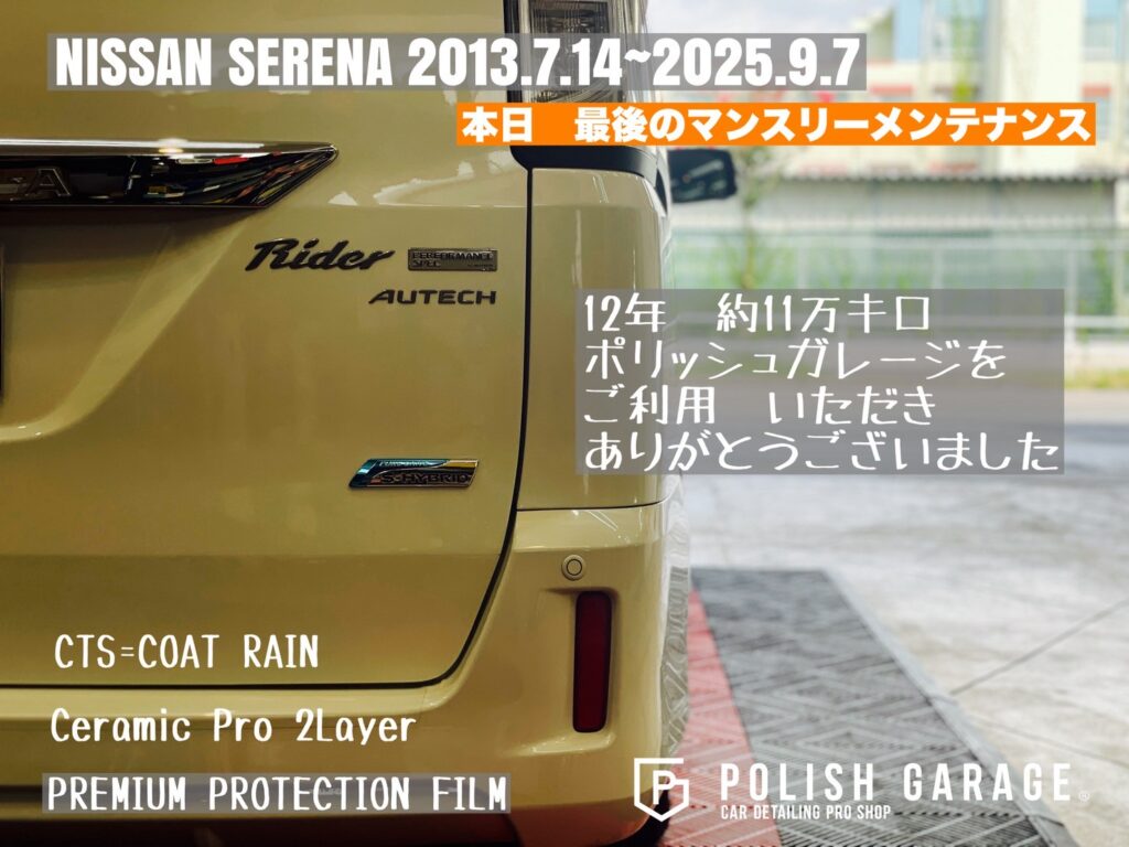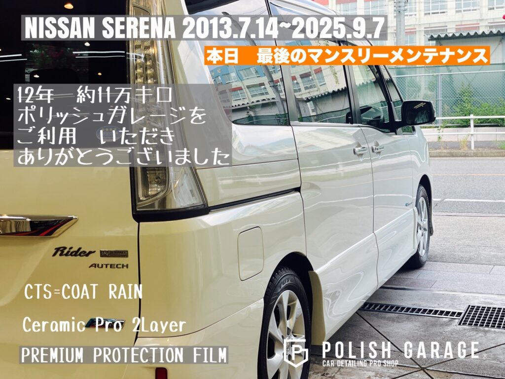 【NISSAN SERENA】セラミックコーティング&PPF施工から12年|最後のマンスリーメンテナンス|名古屋ポリッシュガレージ