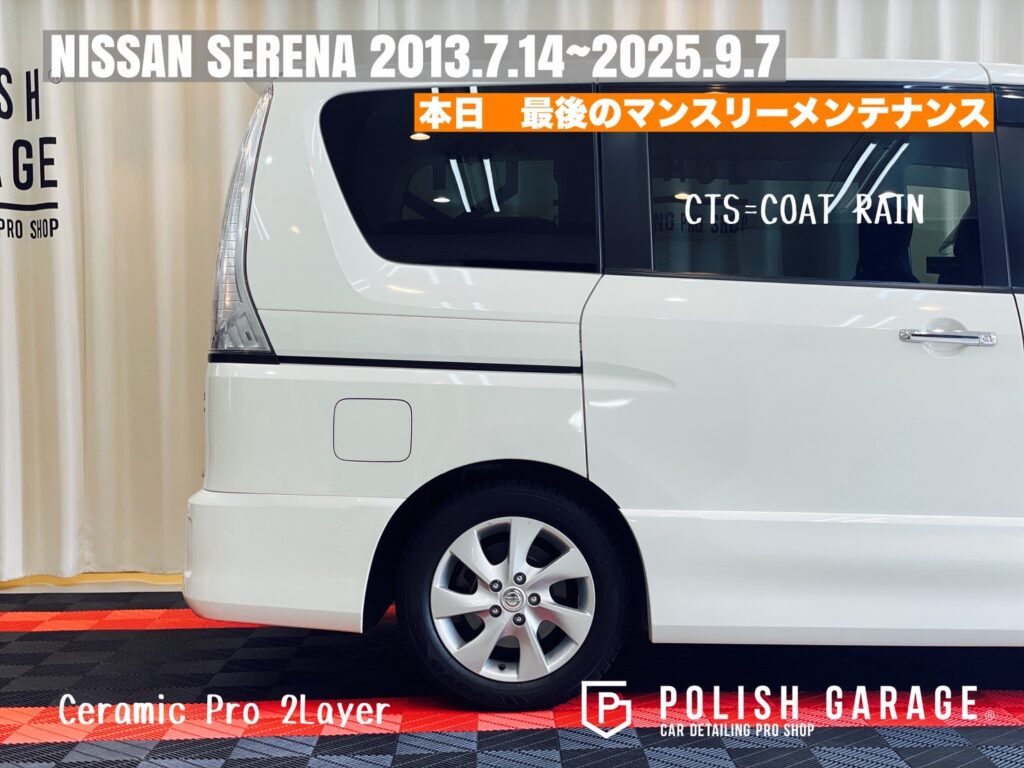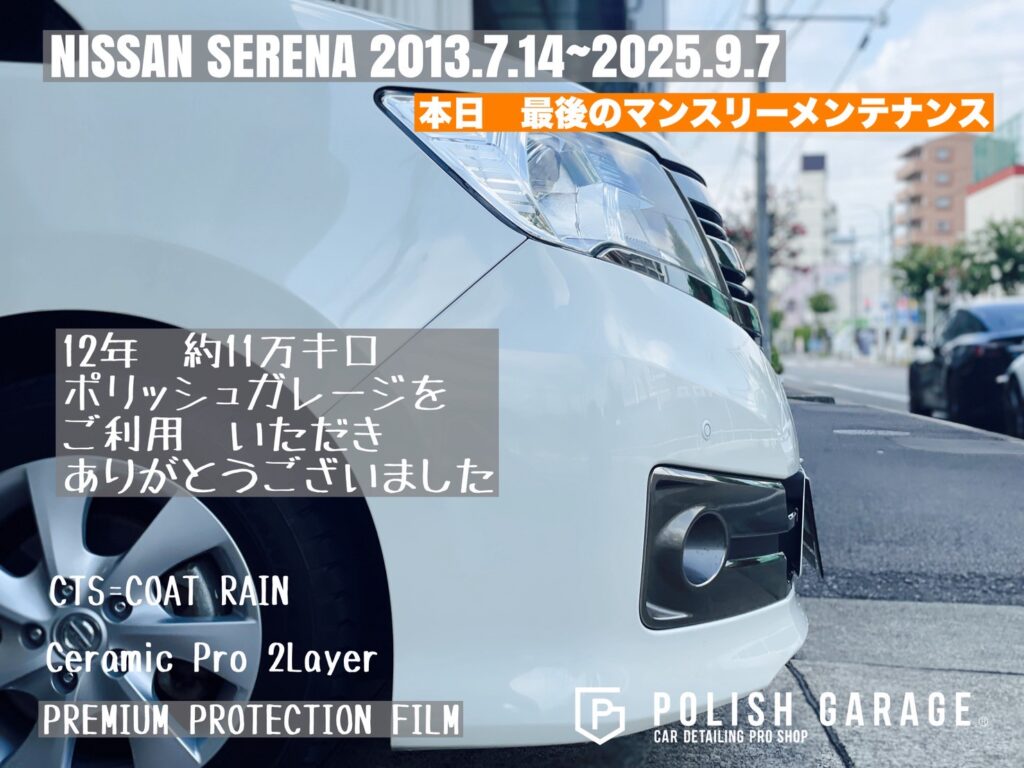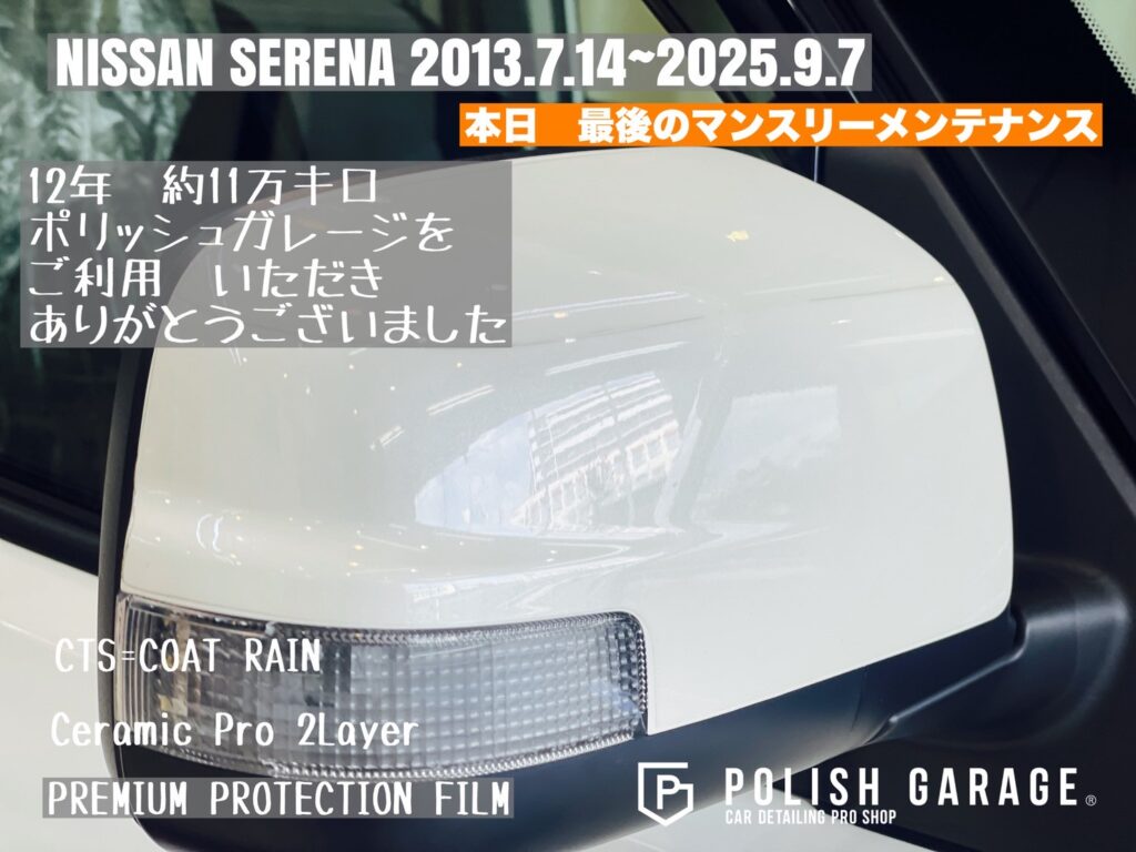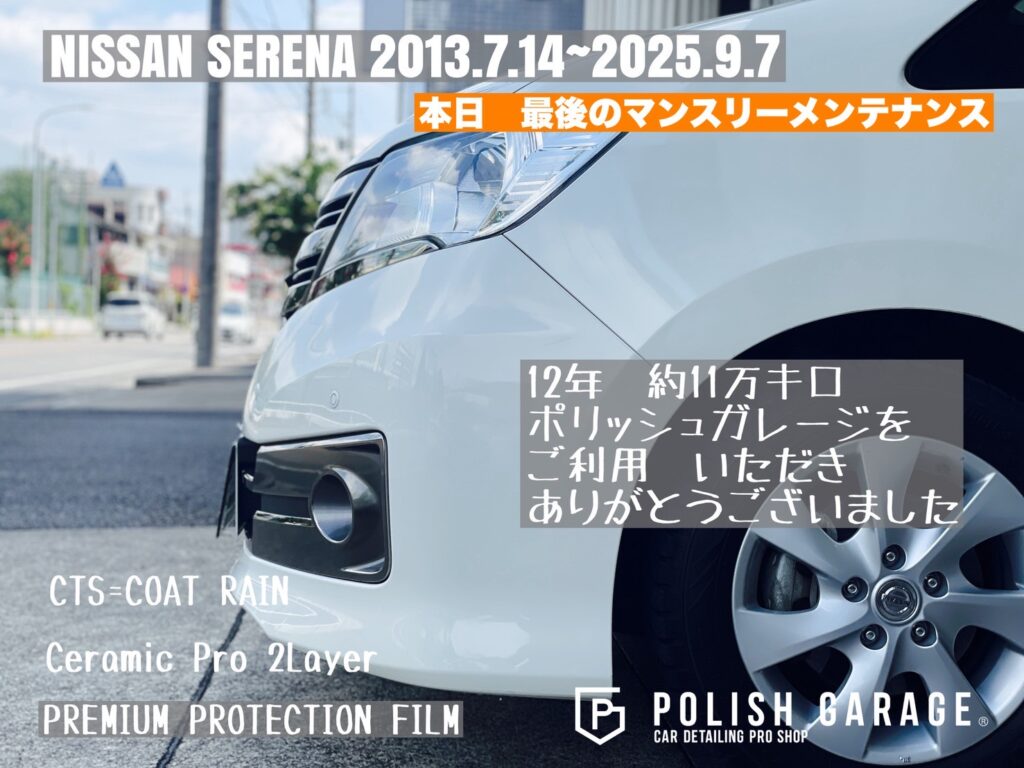 【NISSAN SERENA】セラミックコーティング&PPF施工から12年|最後のマンスリーメンテナンス|名古屋ポリッシュガレージ