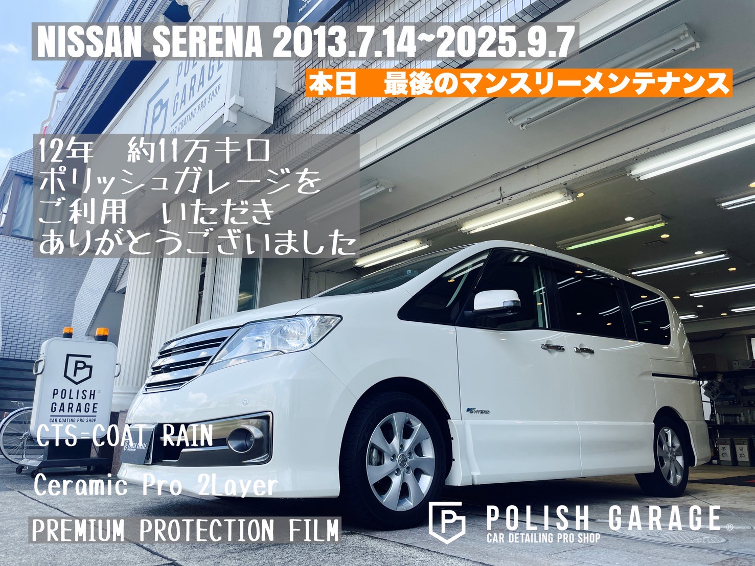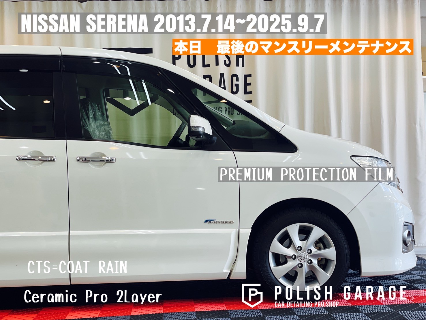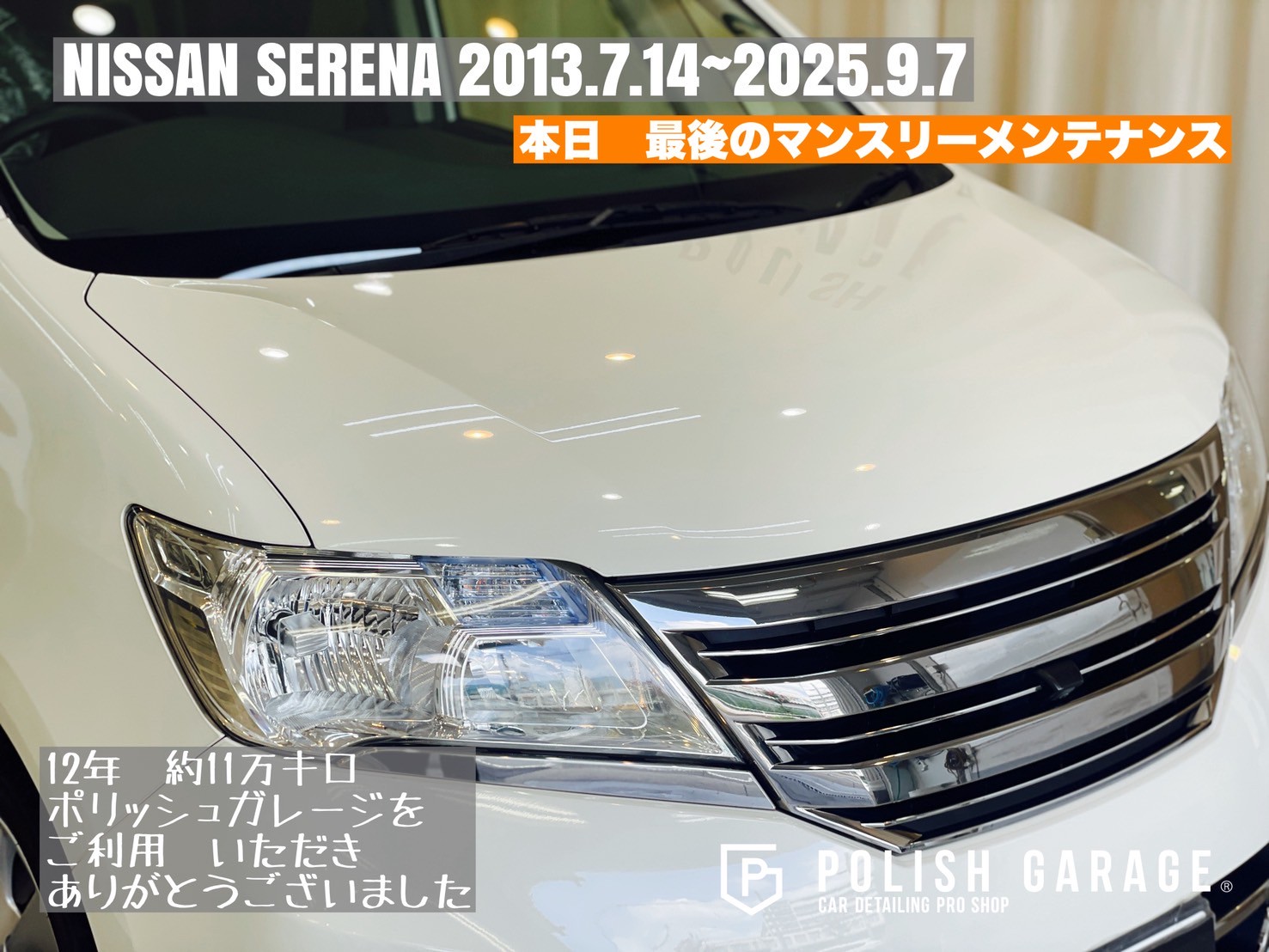 【NISSAN SERENA】セラミックコーティング&PPF施工から12年|最後のマンスリーメンテナンス|名古屋ポリッシュガレージ